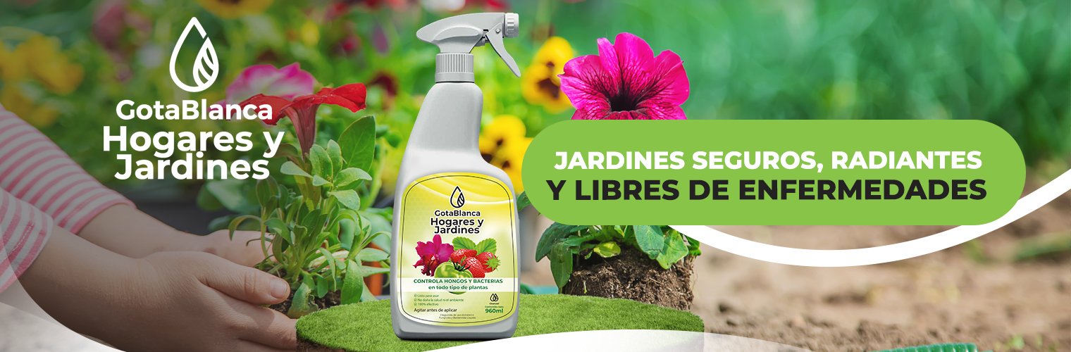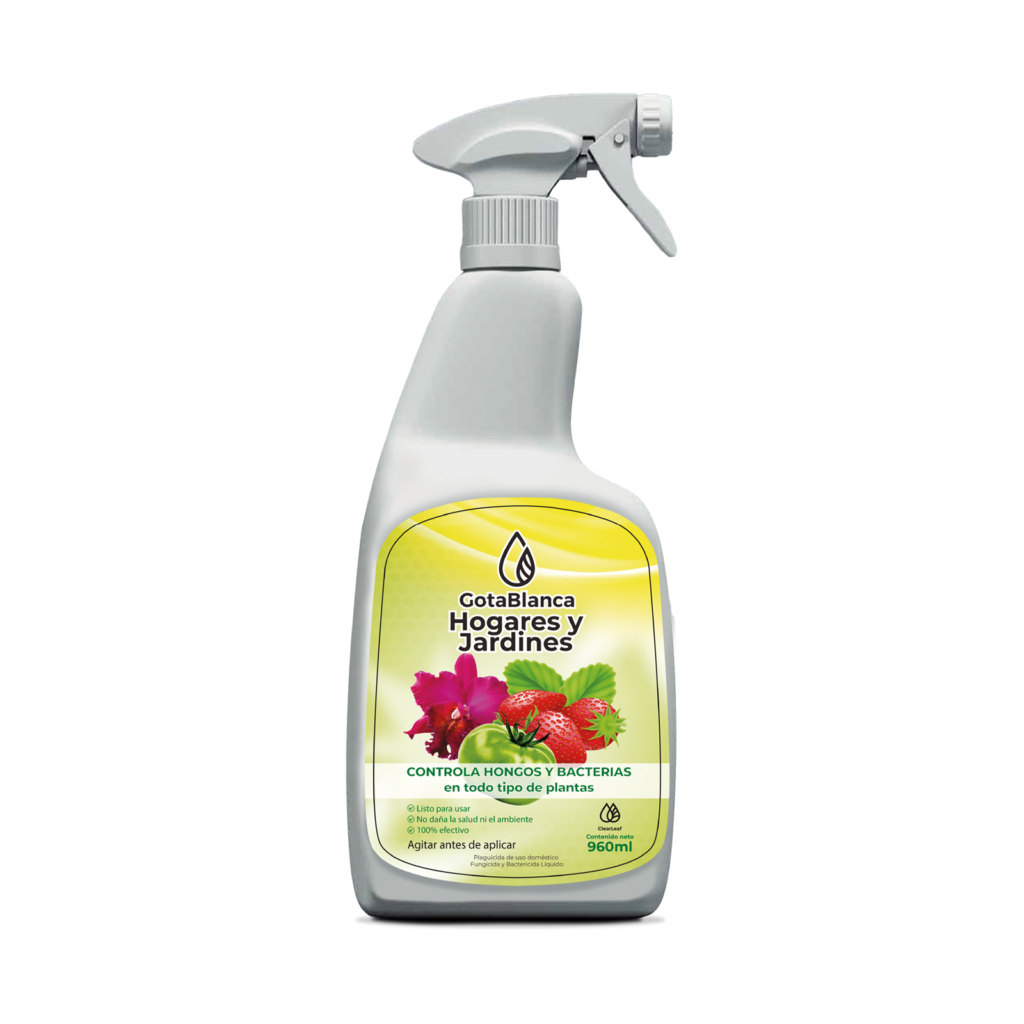 GotaBlanca Hogares y Jardines es la versión de uso doméstico del exitoso GotaBlanca 500. Es un producto listo para usar, formulado con plata elemental y polímeros que aseguran una excelente adherencia en las hojas. Controla eficazmente hongos y bacterias en una amplia variedad de plantas, tanto de interior como de exterior, sin afectar la salud de las personas, los animales, ni el medio ambiente. Es completamente seguro para niños y mascotas, por lo que es ideal para mantener un jardín sano y protegido sin afectar a nuestros seres amados.