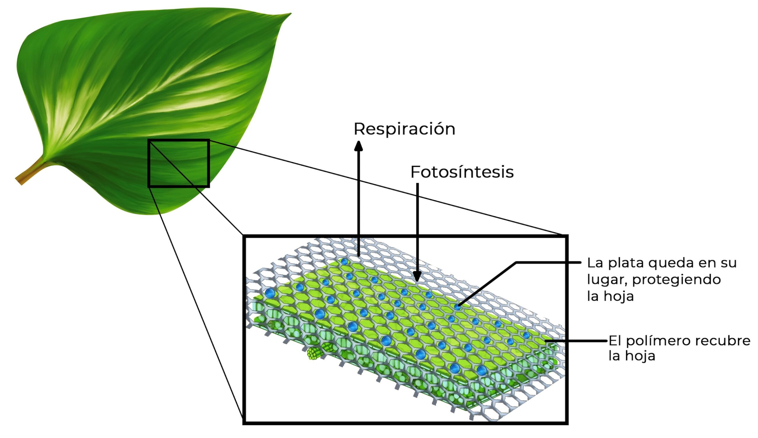 2- Uso de copolímeros de superficie que recubren las plantas con una película invisible, que mantiene las micropartículas de plata elemental en su lugar sin interferir con los procesos naturales de la planta, como la respiración o la fotosíntesis o su crecimiento.