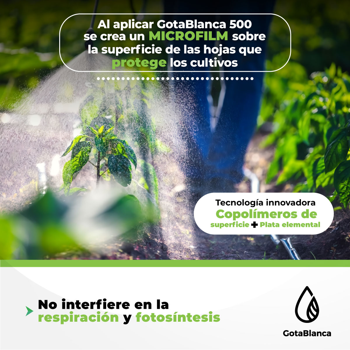 Al aplicar de forma foliar, GotaBlanca 500 crea una micropelícula en la superficie de las hojas, protegiendo los tejidos de manera efectiva, fortaleciendo su resistencia frente a hongos y bacterias, y eliminando la necesidad de usar adherentes o pegas adicionales.